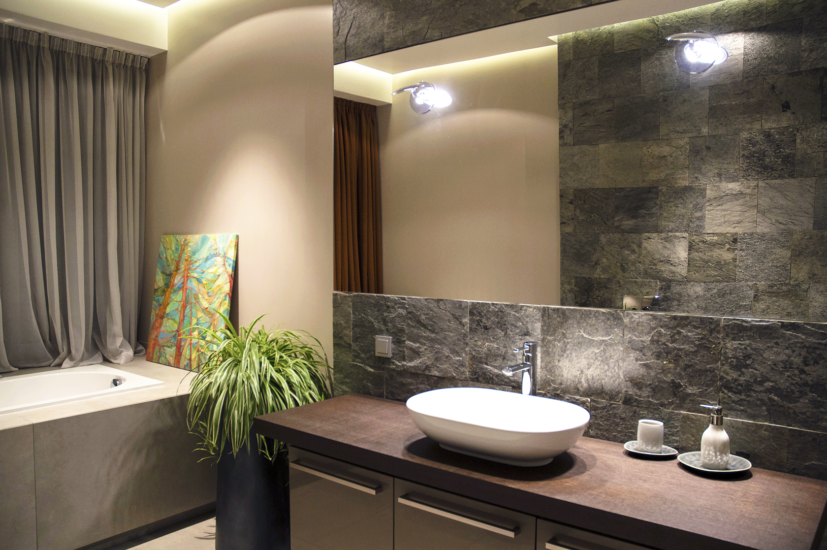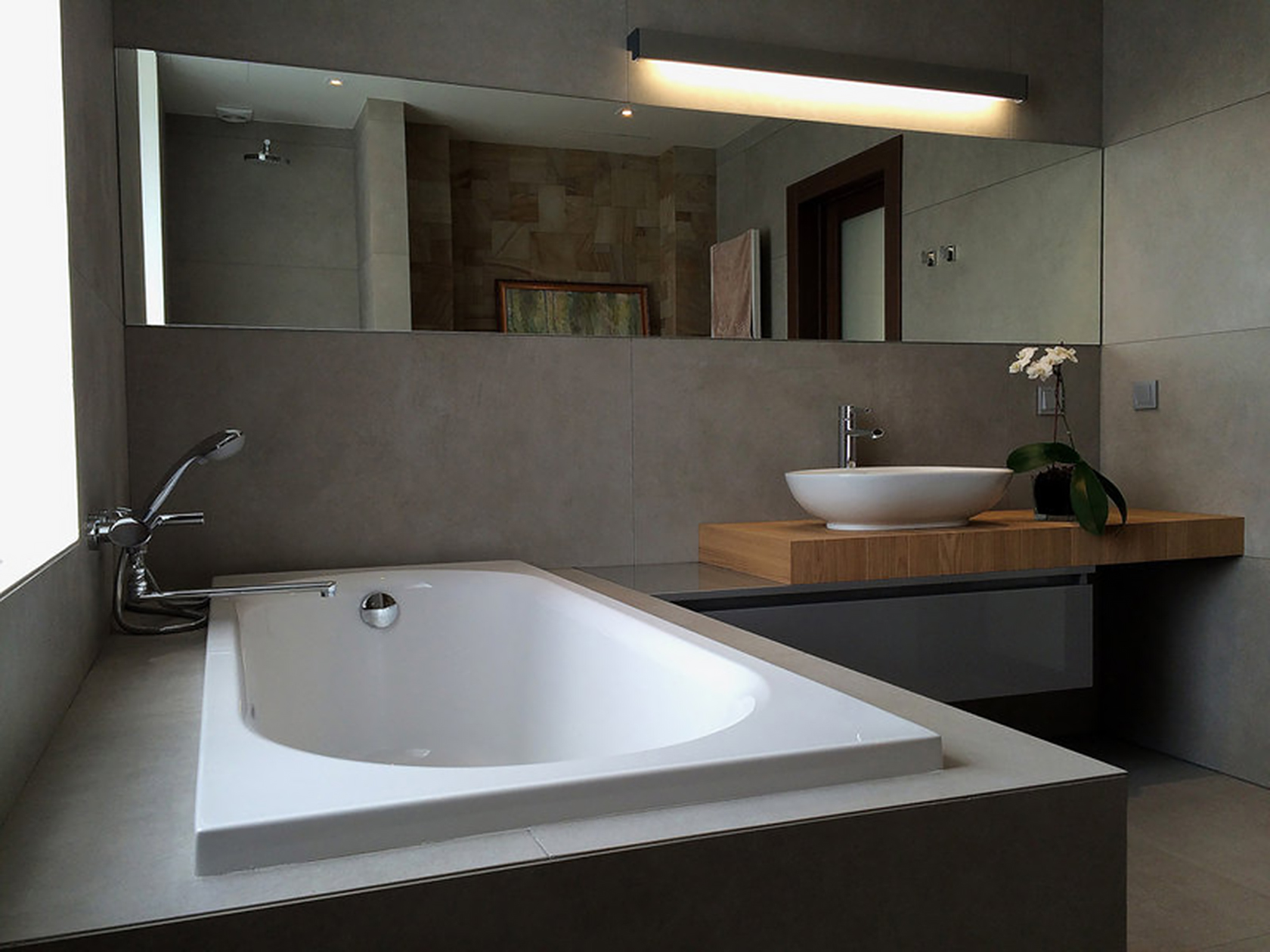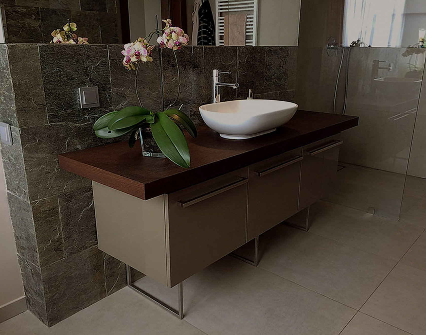 Trzydrzwiowa szafka podumywalkowa z drewnianym blatem doskonale komponuje się z naturalną fakturą kamienia. Wanna znajduje się bezpośrednio przy oknie, co również daje możliwość cieszenia się widokami podczas relaksu.