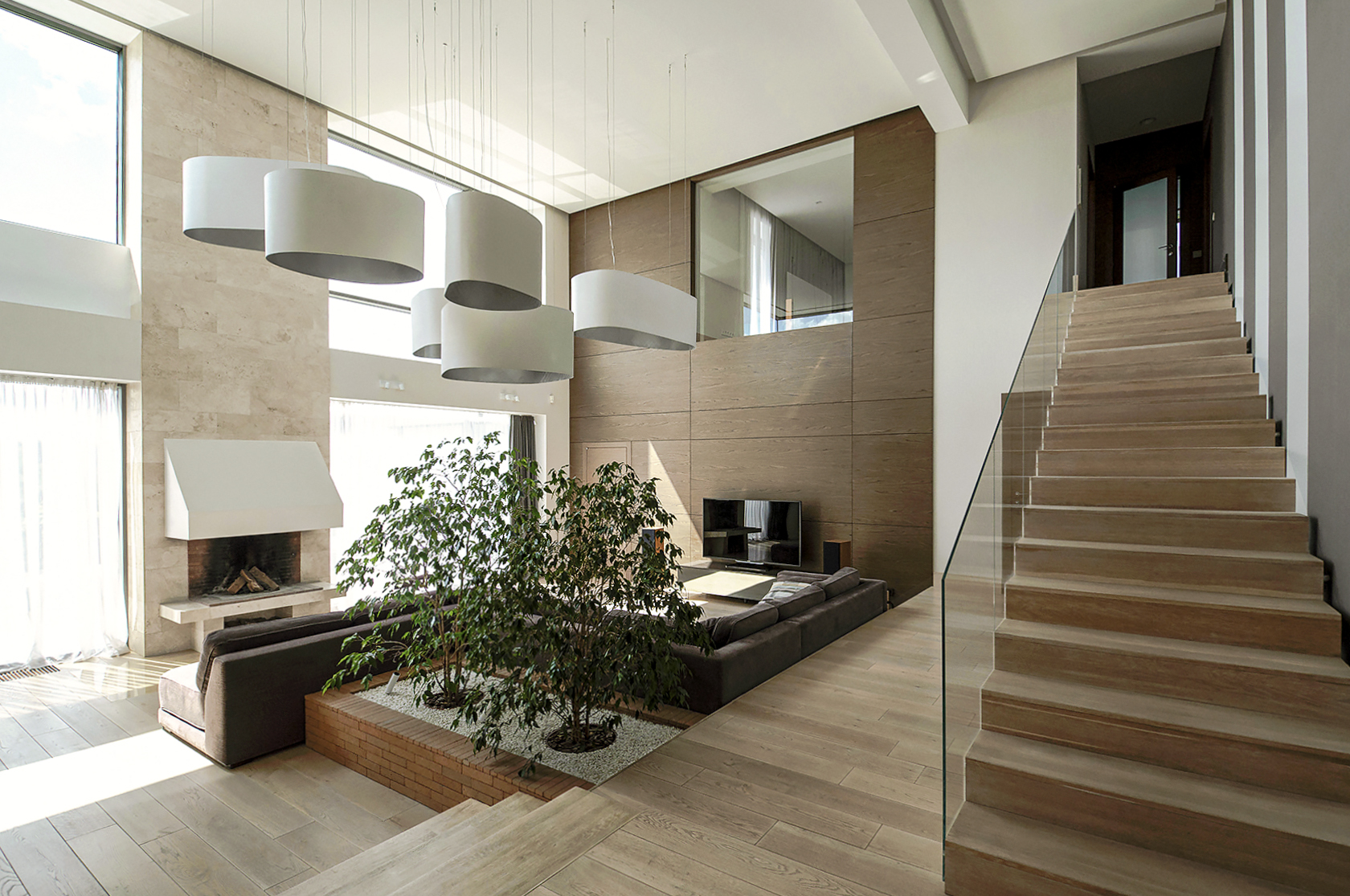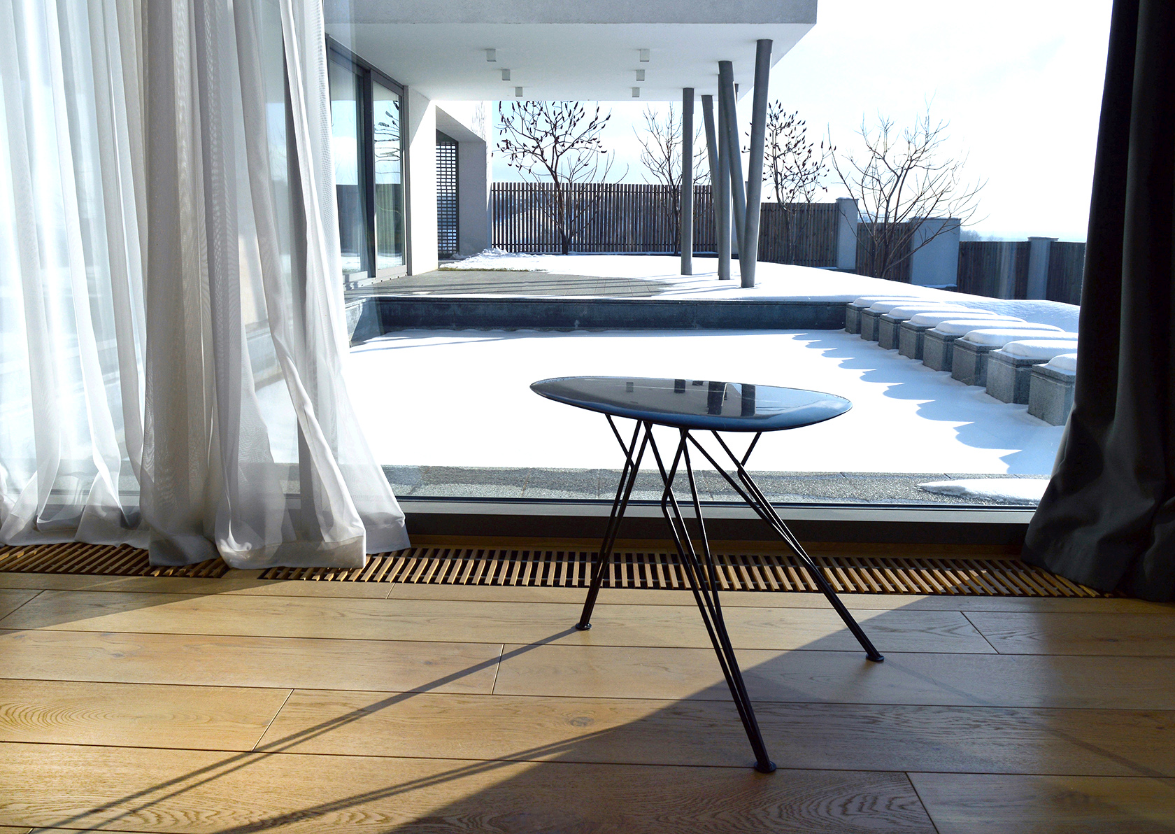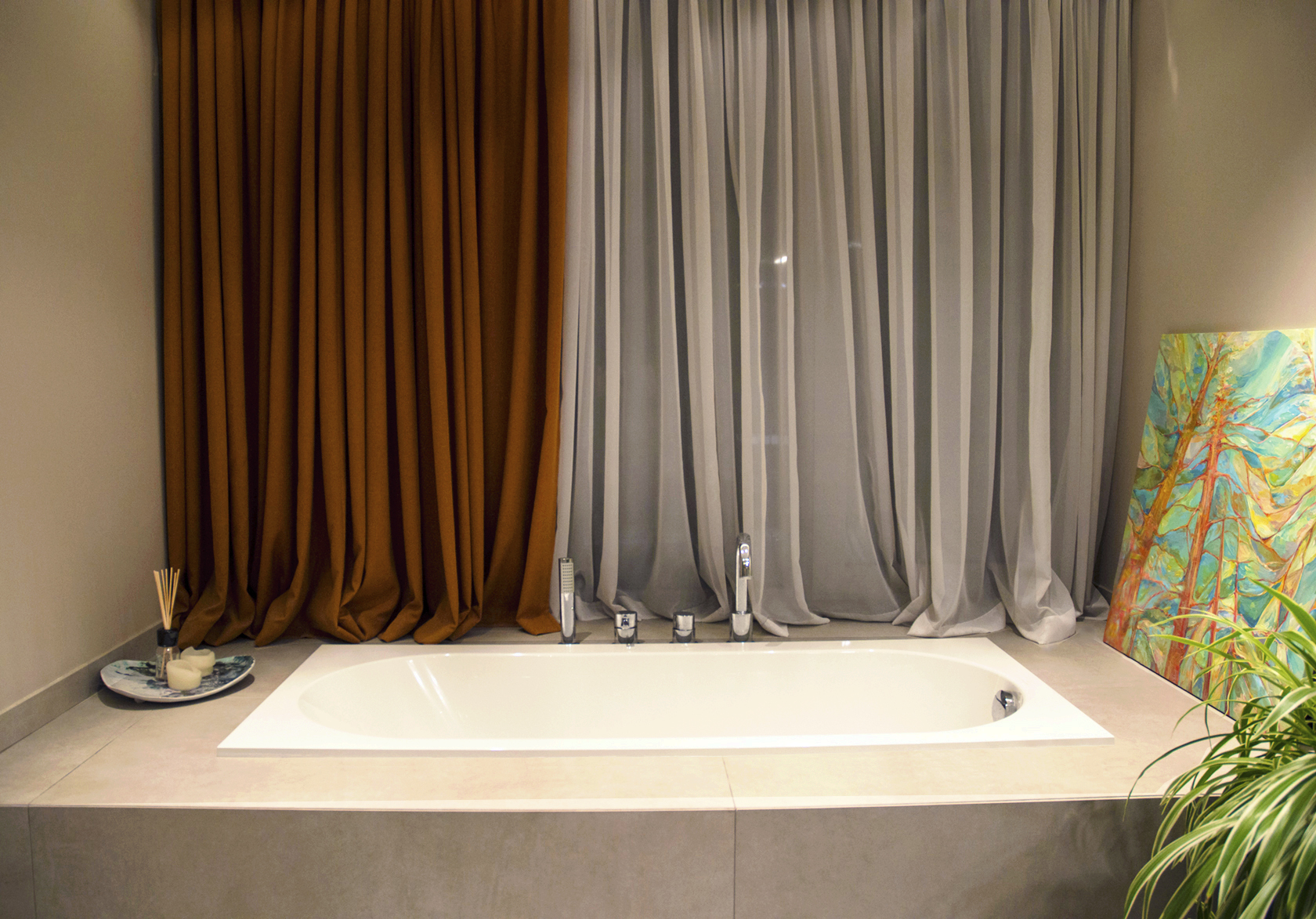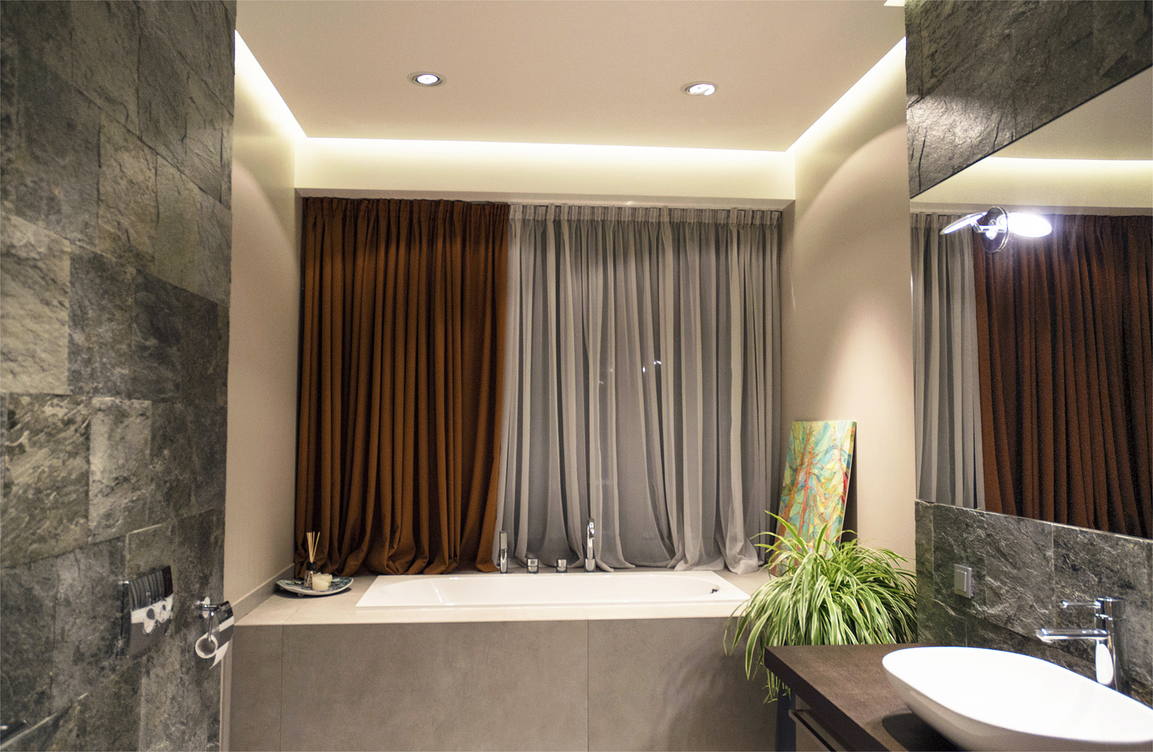 Trzydrzwiowa szafka podumywalkowa z drewnianym blatem doskonale komponuje się z naturalną fakturą kamienia. Wanna znajduje się bezpośrednio przy oknie, co również daje możliwość cieszenia się widokami podczas relaksu.
