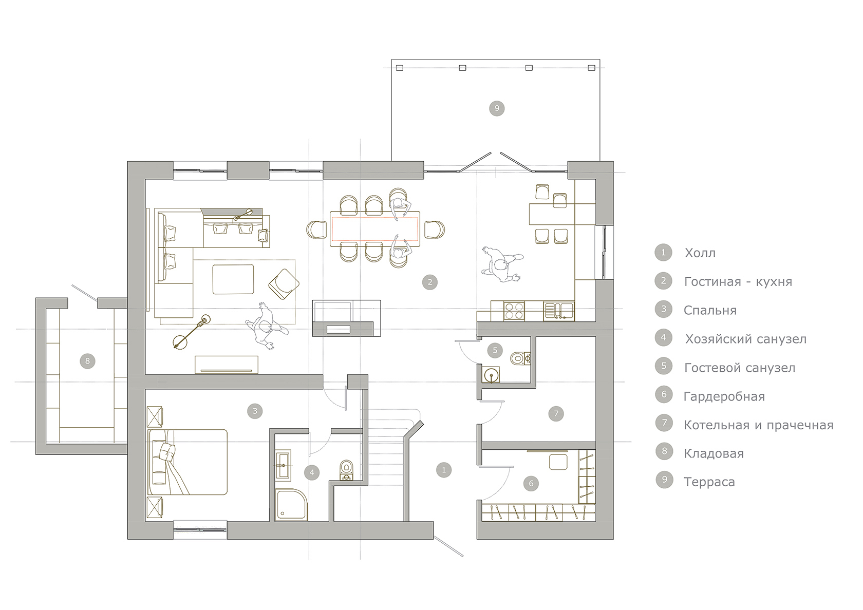 Проект интерьера этого дома пока на стадии разработки, хотя основной концепт помещений уже согласован. Заказчик - молодой мужчина, живущий один, предпочел стиль White Loft для оформления своего жилья. Свой интерьер он видел просторным, светлым и уютным, но при этом слегка брутальным, в лучших традициях лофта.