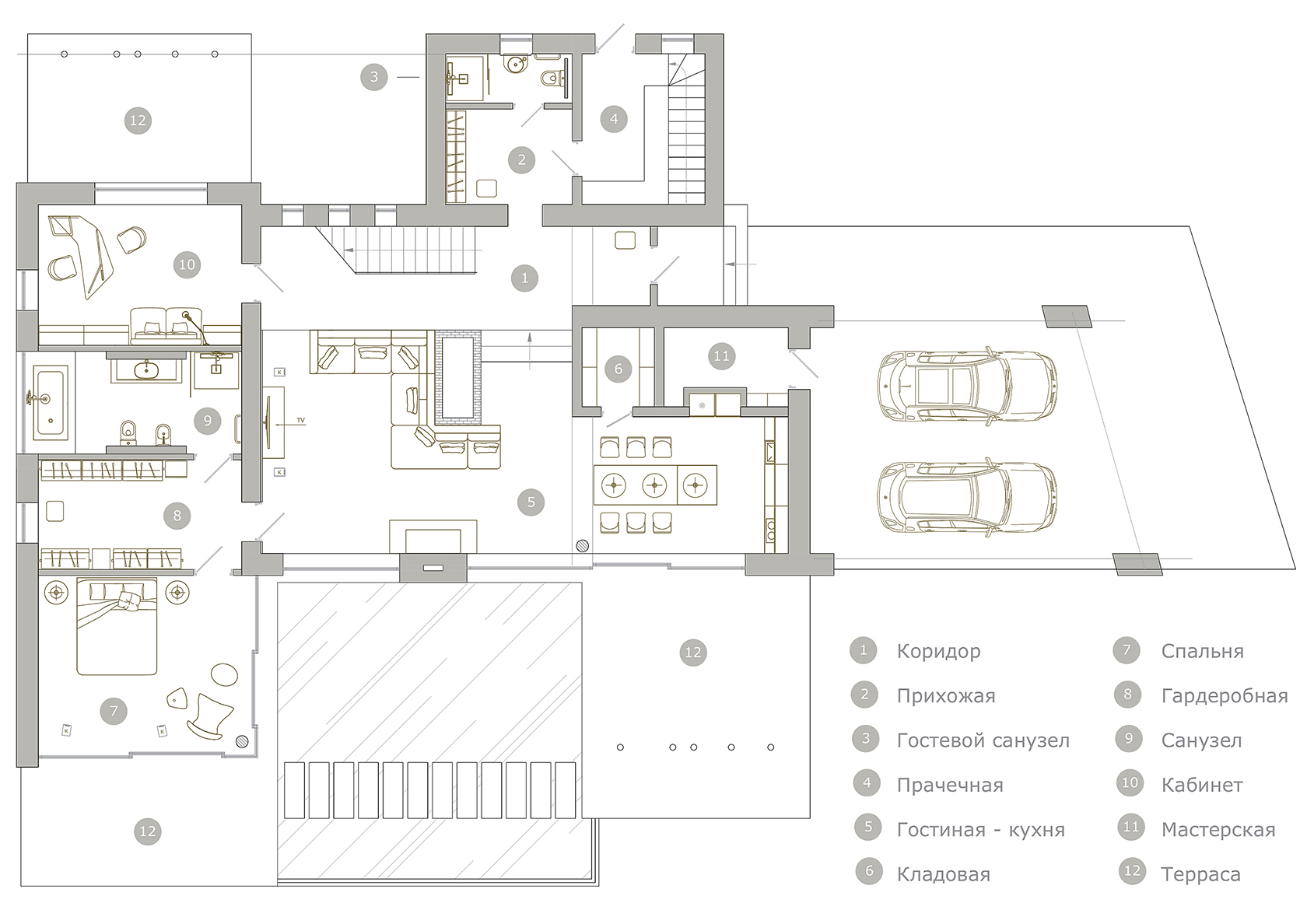Интерьер помещений реализован в минималистическом стиле, который отвечает архитектурной стилистике самого здания. В оформлении интерьера преобладают натуральные материалы и фактуры.