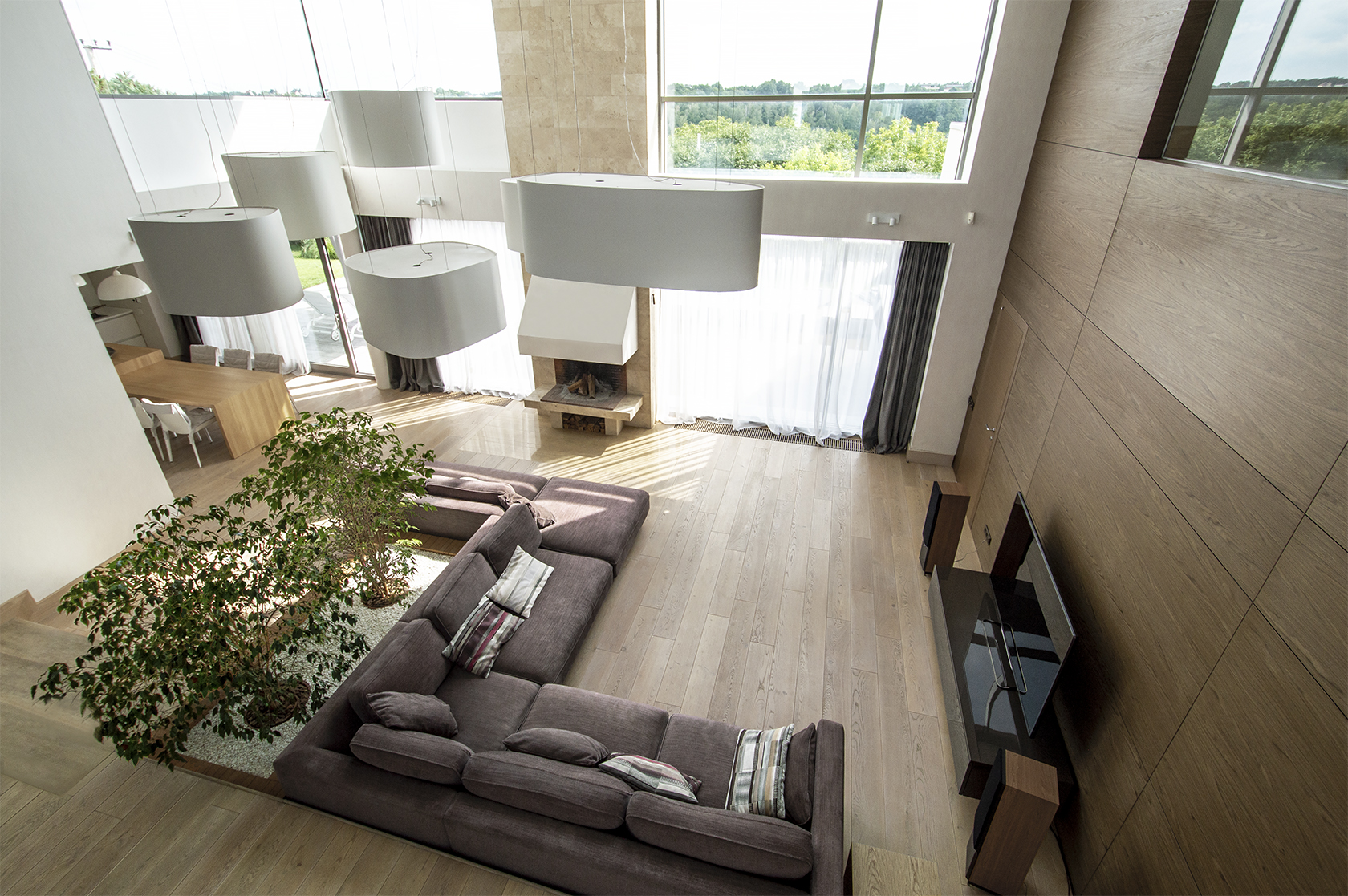 Просторные открытые планировки помещений, светлые тона и достаточно спокойная цветовая палитра отделочных материалов, создают общее впечатление легкости и комфорта, а также не отвлекают внимание от красивых панорамных видов, открывающихся из окон дома.