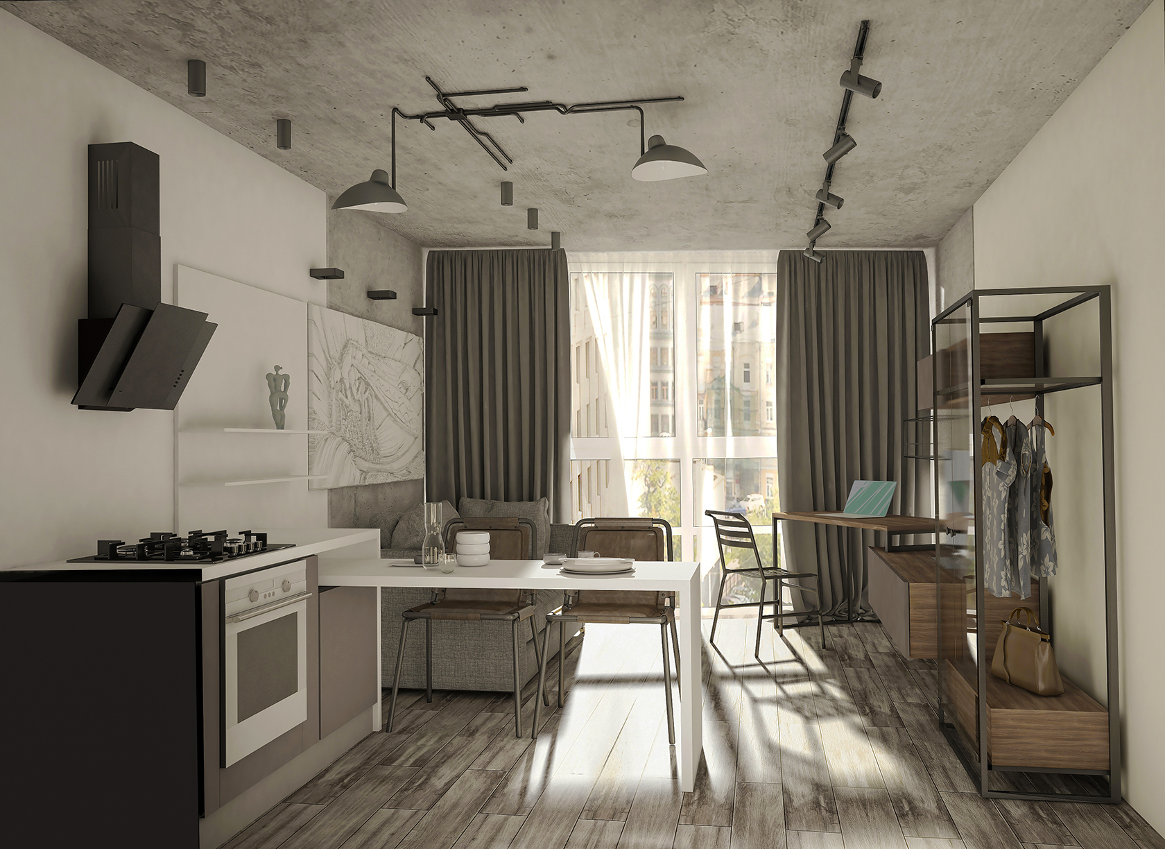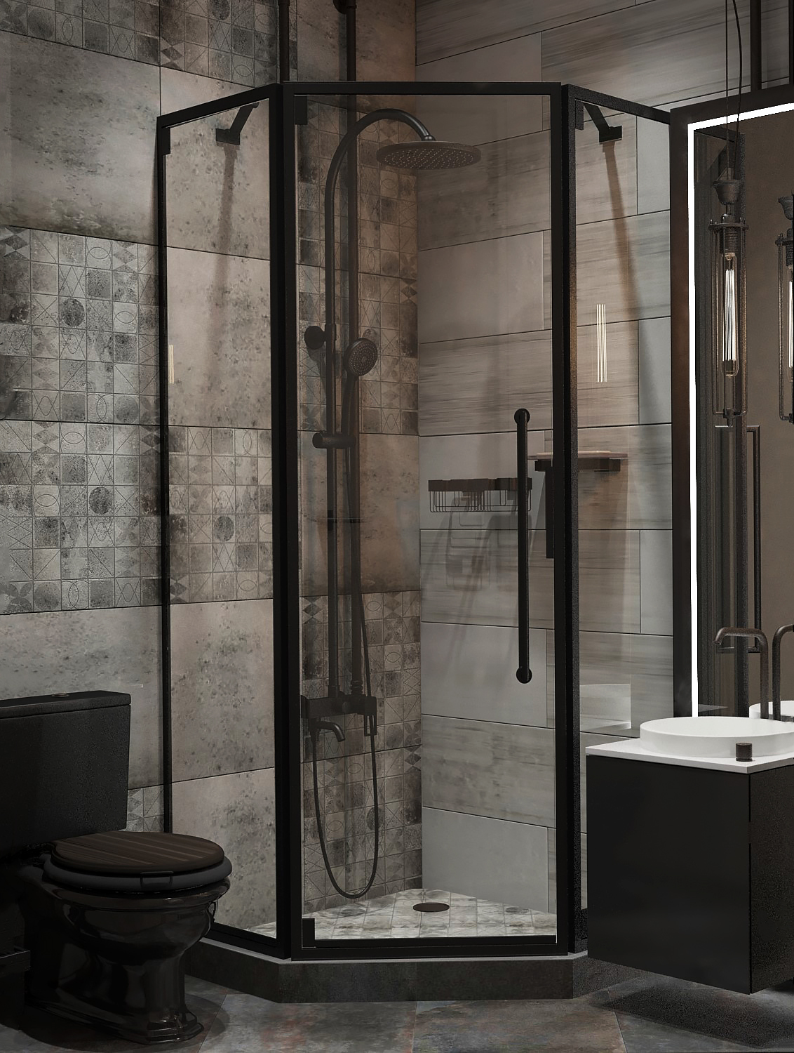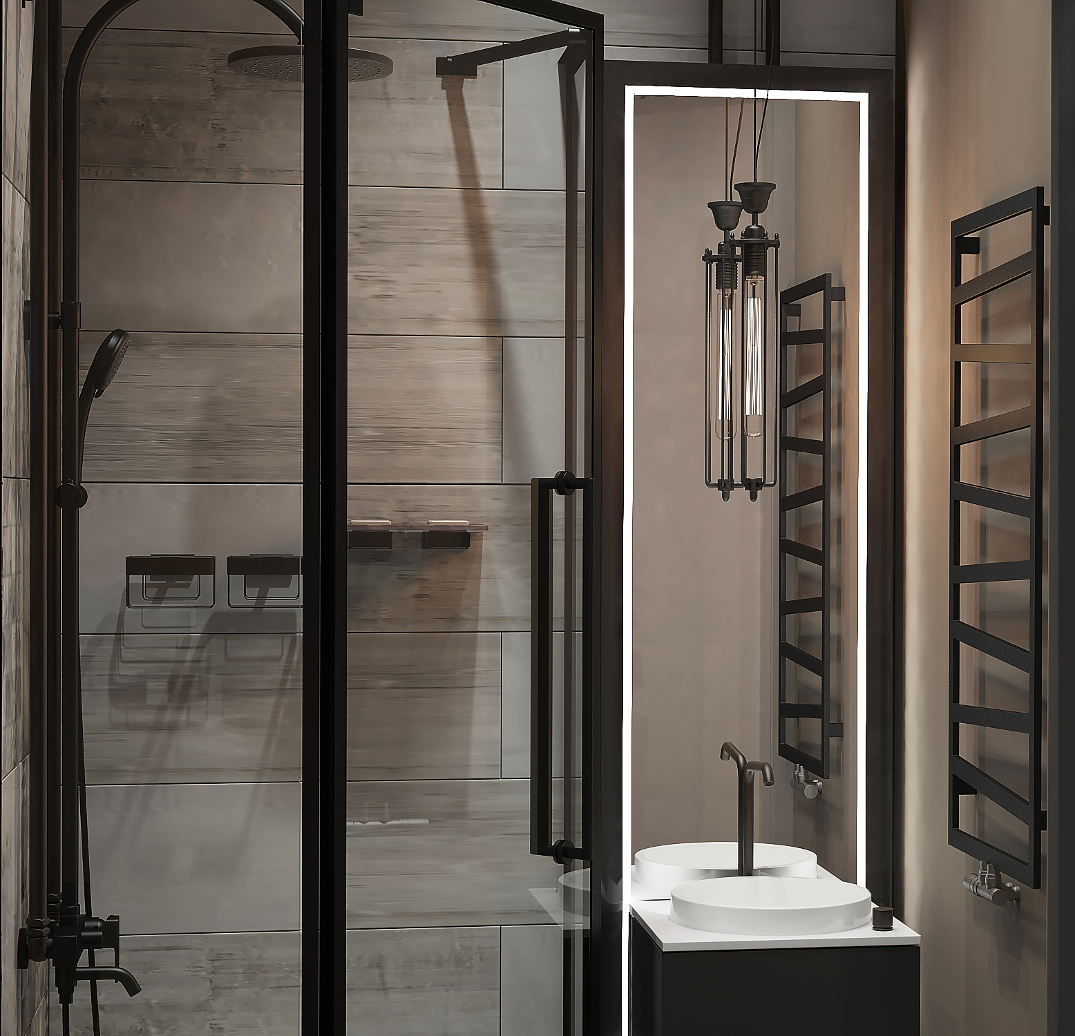 Санузел, стилистикой своего оформления, созвучен с общим концептом интерьера квартиры. Подвесная секция для умывальника с подсветкой внизу создает впечатление легкости, несмотря на очень маленькие размеры помещения, санузел не кажется слишком заполненным.