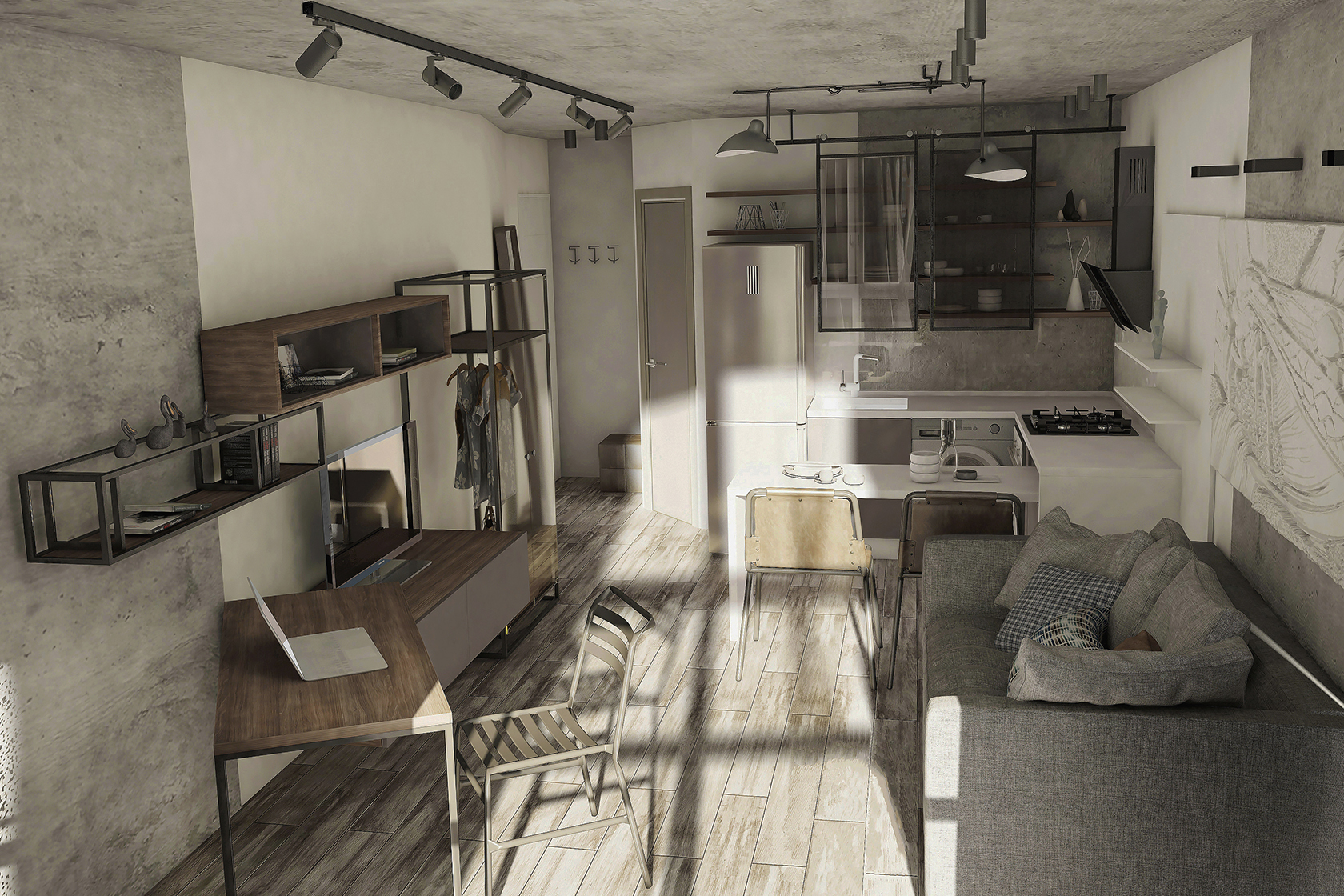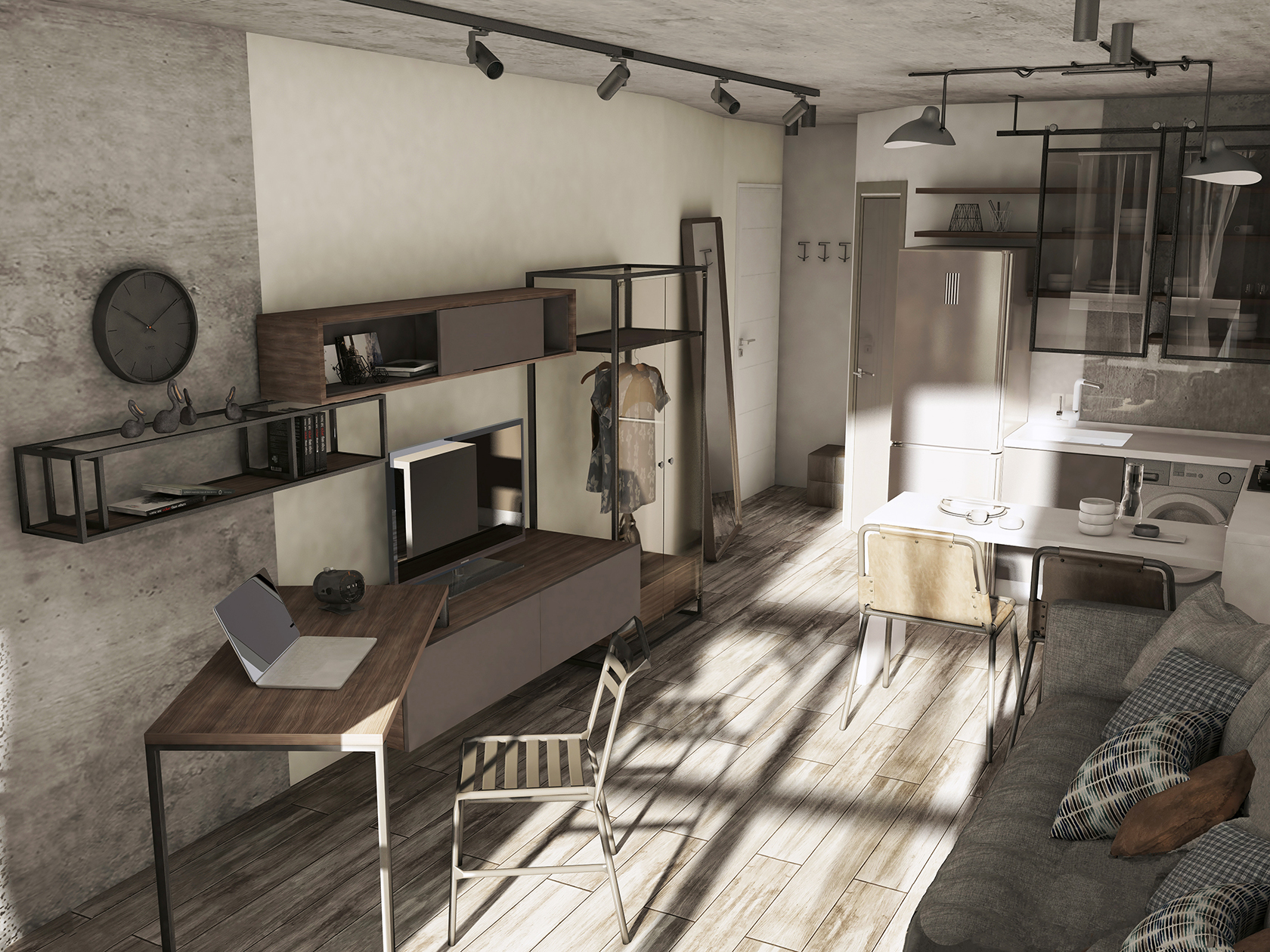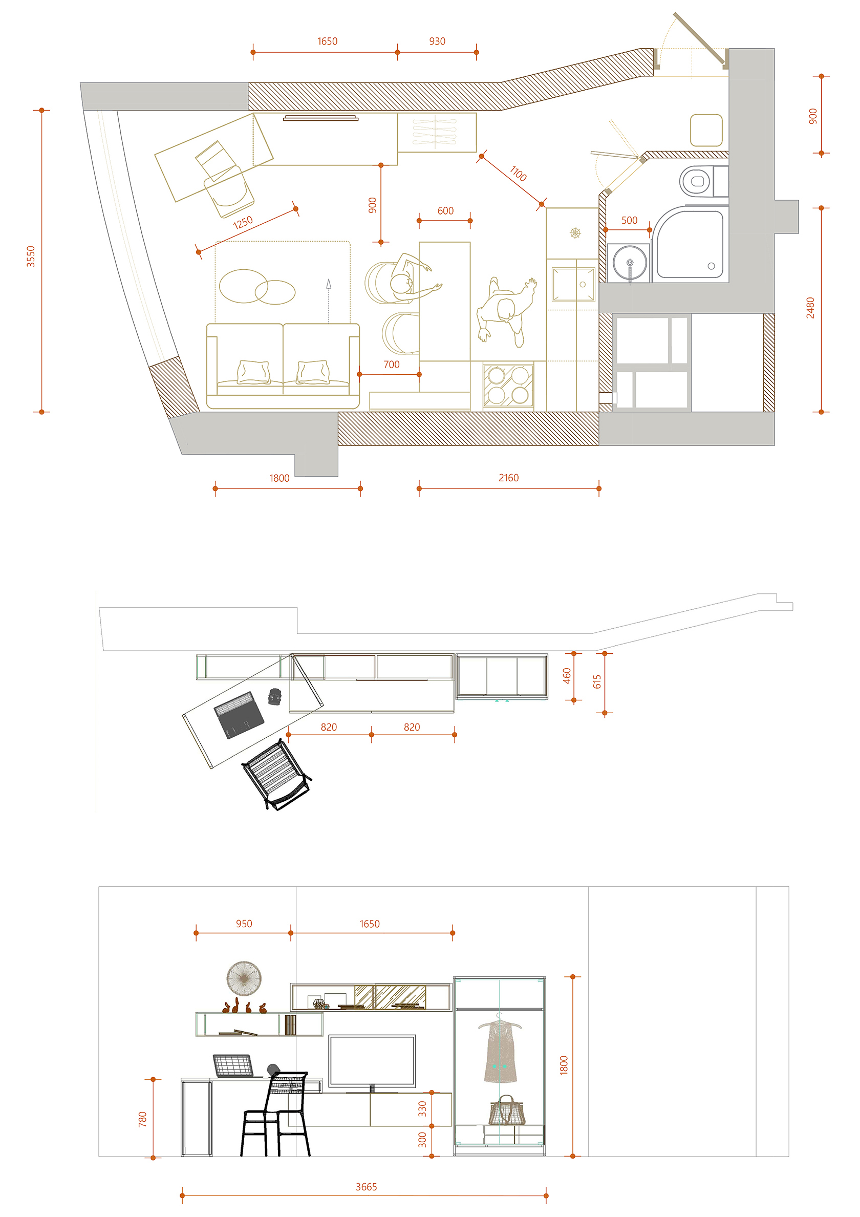 Санузел, стилистикой своего оформления, созвучен с общим концептом интерьера квартиры. Подвесная секция для умывальника с подсветкой внизу создает впечатление легкости, несмотря на очень маленькие размеры помещения, санузел не кажется слишком заполненным.
